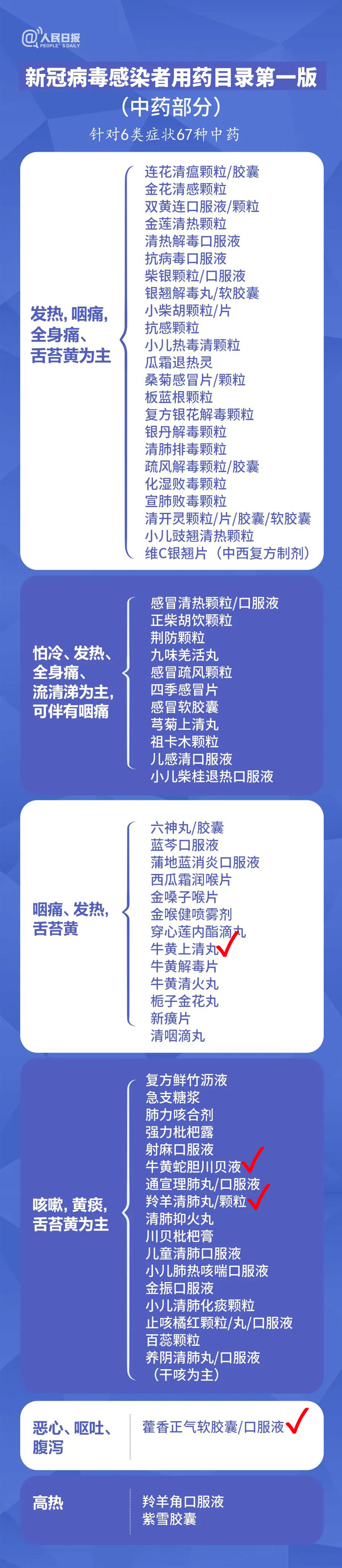 此版用药目录按照中西药分开的原则,是对国家第九版诊疗方案中推荐用药的完善和补充,针对发热、咽痛等6类中医诊断症状推荐67个中药品种;针对咳嗽、咳痰等4类临床症状推荐41个西药品种。