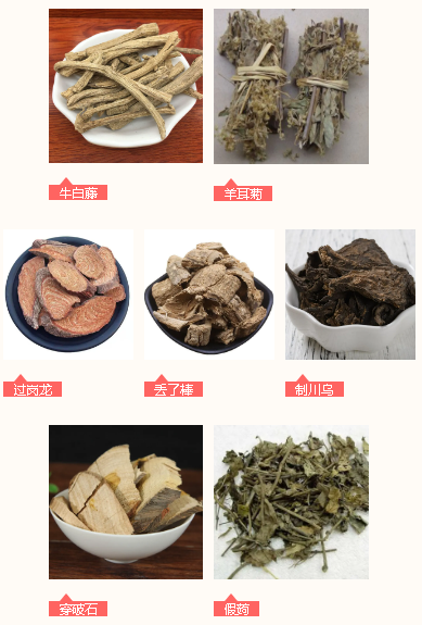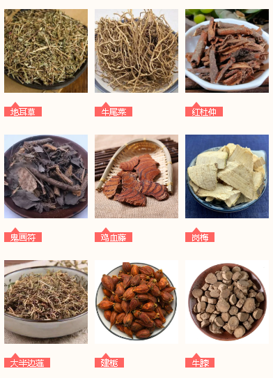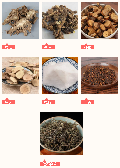 佐使药:地耳草、牛尾菜、红杜仲、鬼画符、鸡血藤、岗梅、大半边莲、建栀、牛膝、独活、苍术、桂枝、乌药、樟脑、丁香、鹅不食草。