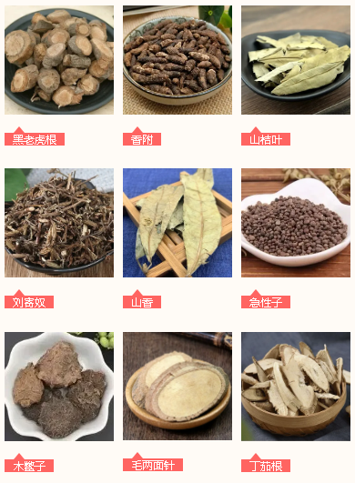 君药:黑老虎根、香附、山桔叶、刘寄奴、山香、毛两面针、急性子、木鳖子、丁茄根